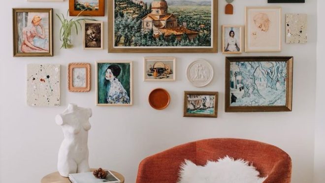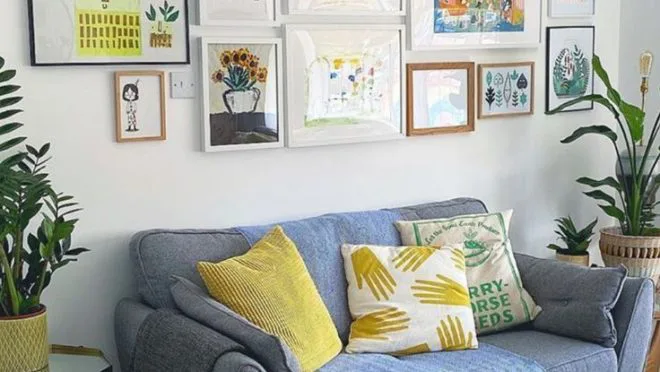 Crie uma parede de quadros com fotos e arte que reflitam sua personalidade, adicionando carácter ao ambiente.