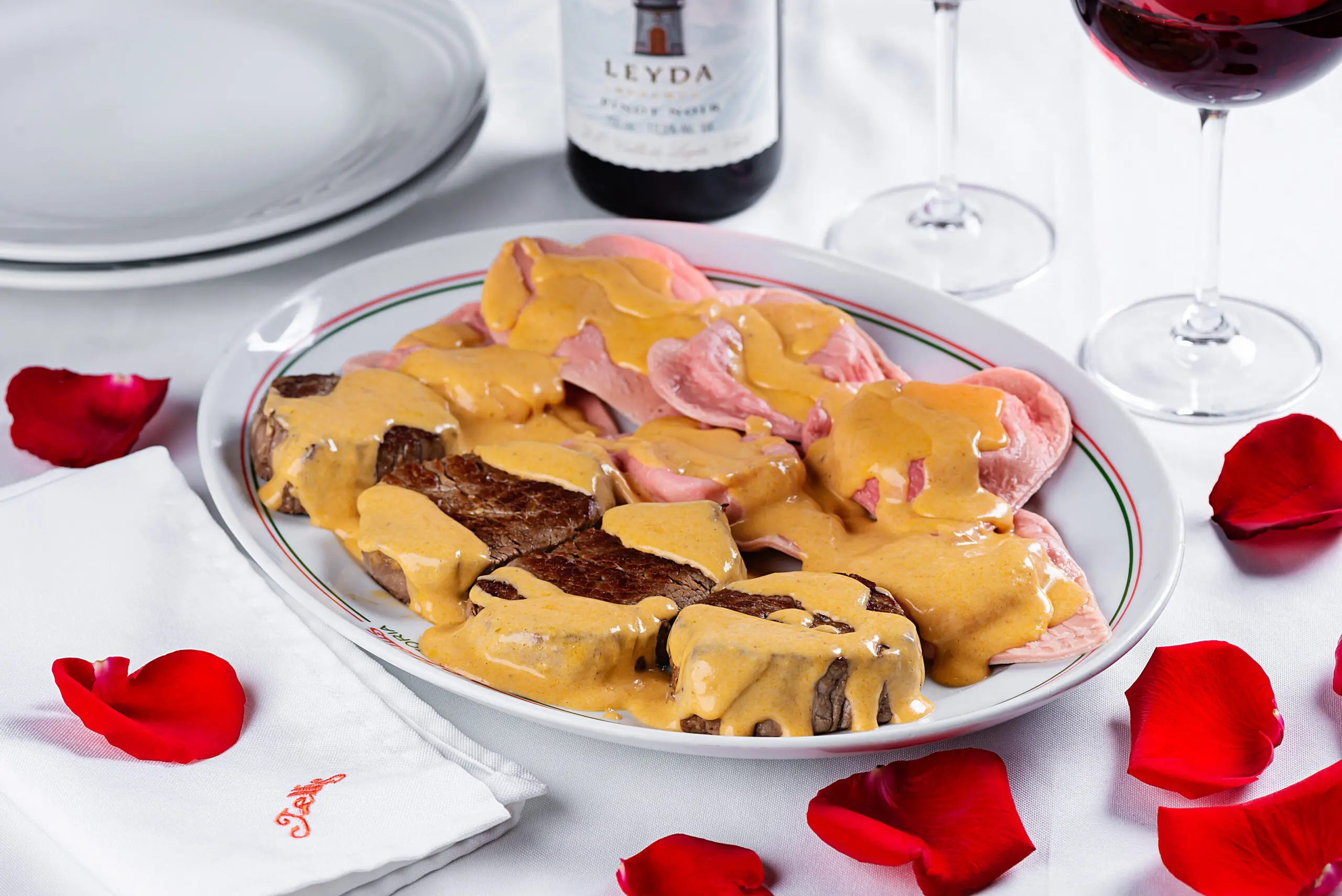 O prato para o casal (R$ 255,90) é composto por filé mignon grelhado, acompanhado por ravioloni rosé em formato de coração, recheados com muçarela de búfala e regados com molho rosé gratinado. A sugestão estará disponível tanto no almoço quanto no jantar.