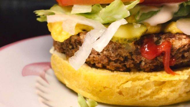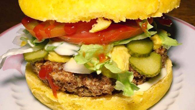 Marmitas veganas com opção de mini hambúrguer vegano.