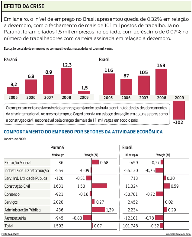 Na divisão por setores de atividade econômica, a construção civil apresentou o maior porcentual de criação de vagas no Paraná em janeiro, com variação de 1,5%, criando pouco mais de 1,6 mil novos postos. No entanto, este número, que representa 14,4% do resultado nacional do setor (11,3 mil vagas), precisa ser relativizado, uma vez que o setor fechou 3,6 mil vagas no estado em dezembro de 2008. Isso significa que o resultado de janeiro recupera apenas 45% das vagas fechadas no fim do ano passado.