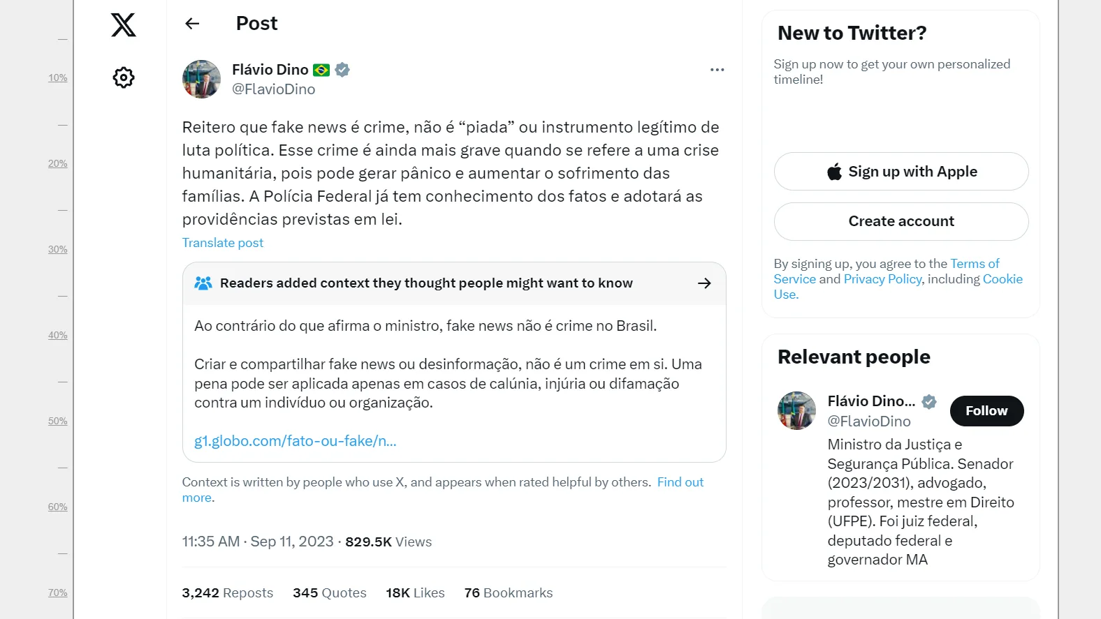 Com o auxílio de um cientista de dados, a Gazeta do Povo examinou todas as cinco notas propostas pelos contribuidores para um tweet de 11 de setembro em que o ministro da Justiça, Flávio Dino, alegou que “fake news é crime, não é ‘piada’ ou instrumento legítimo de luta política”. Ele se referia a supostas declarações falsas a respeito das vítimas das chuvas no Rio Grande do Sul. Na ocasião, analistas estranharam que uma nota adicionada à publicação do ministro, que dizia “Ao contrário do que afirma o ministro, fake news não é crime no Brasil”, foi mais tarde removida.