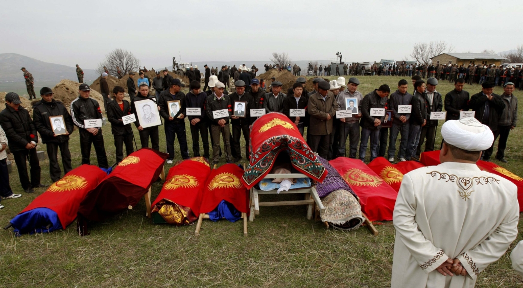 Cerca de 10.000 pessoas em luto se reuniram, nos arredores da capital do Quirguistão, para um funeral de ao menos 78 pessoas mortas quando tropas leais a Bakiyev atiraram em manifestantes da oposição na quarta-feira, durante a revolta.