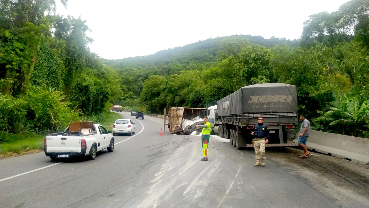 De acordo com a Polícia Rodoviária Federal (PRF), o tráfego está sendo feito pelo acostamento de uma das faixas. O trânsito foi desviado após a colisão entre os caminhões, ocorrida por volta das 12h30. Não houve feridos no acidente. Um guincho será necessário para a remoção dos dois veículos, mas até às 15h45 ele ainda não havia chegado ao local da batida.