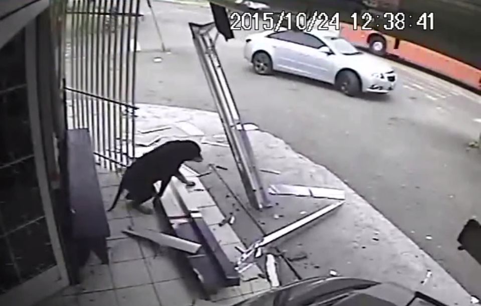 O vídeo gravado com as câmeras de segurança da pastelaria, que fica na localidade Jardim Paranaense, mostra o momento em que o motorista perde o controle do automóvel e atinge o estabelecimento. O animal havia acabado de entrar na pastelaria quando grades e pilastras do local foram abaixo com o acidente.