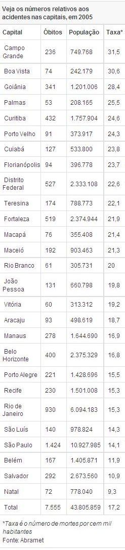 A capital de Mato Grosso do Sul registrou, em 2005, 31,5 óbitos no trânsito por cem mil habitantes. Em Boa Vista, foram 30,6. E, em Goiânia, 28,4. Em Natal, foram anotadas 9,3 mortes por cem mil habitantes. Em Salvador, 10,9 e, em Belém, 11,9. São Paulo aparece logo em seguida, com uma das taxas mais baixas: 14,1.