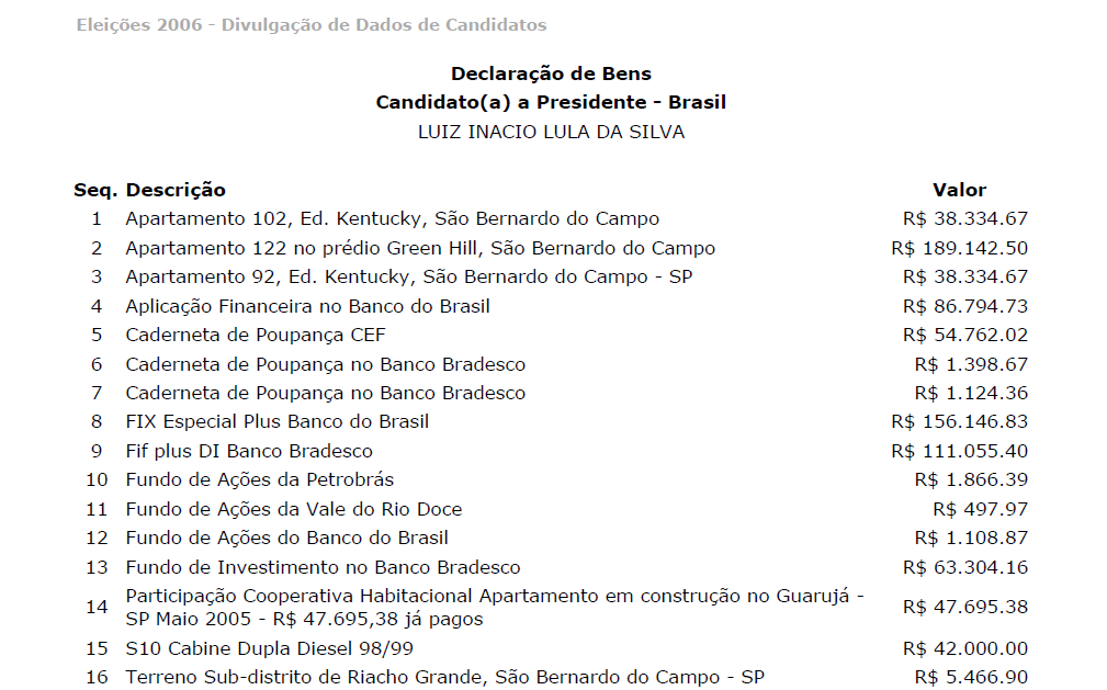 A nota reproduz o contrato para a compra de uma cota-parte da Bancoop pela ex-primeira-dama Marisa Letícia, em 2005, e anexa comprovante de pagamentos mensais à Bancoop e diz que a família investiu R$ 286 mil em valores atualizados na cota, que daria direito a opção de compra da unidade 141, de 82 metros quadrados, no condomínio. O investimento foi declarado pelo ex-presidente ao Tribunal Superior Eleitoral na campanha presidencial de 2006.