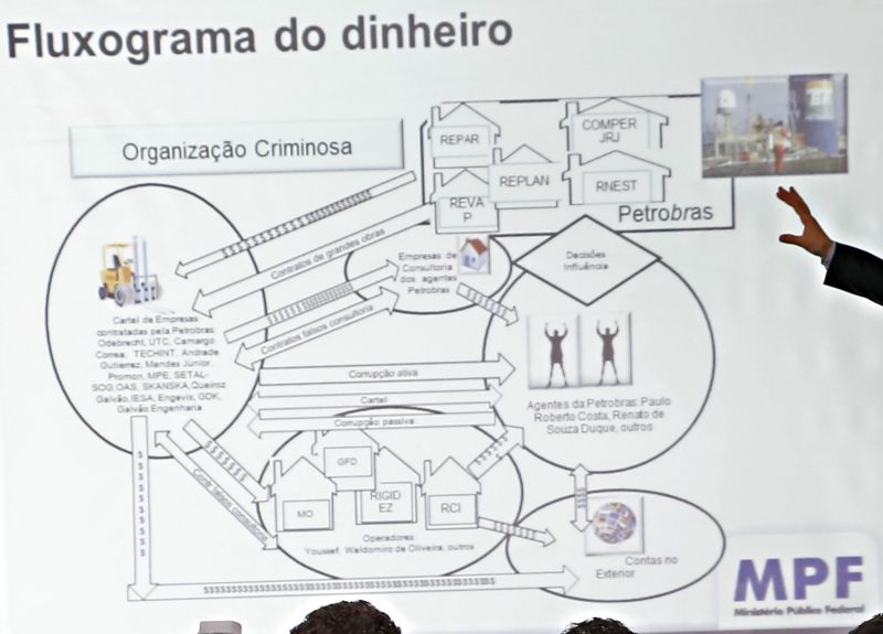 "A Petrobras é vítima deste esquema", disse o procurador Deltan Martinazzo Dallagnol. Durante a explicação sobre os crimes cometidos na estatal, Dallagnol dividiu o esquema em três núcleos: empreiteiras, funcionários públicos e operadores financeiros, a quem chamou de "profissionais em lavagem de dinheiro".