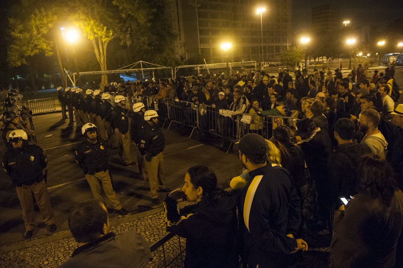 Com um cobertor na mão, uma professora caminha até um policial que fazia guarda na entrada do local. “Vocês não vão mais jogar pimenta na gente, né?”, pergunta. O policial sorri e diz que não quer isso. “Eu sei que vocês são bonzinhos, o problema é o [Batalhão de] Choque”, responde a professora. Ela conta que desmaiou depois de levar um jato no rosto durante um conflito com a PM naquela manhã.