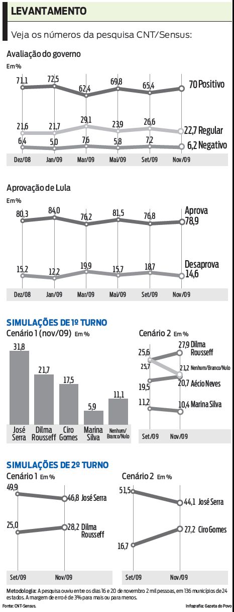 Na disputa direta com a ministra da Casa Civil, Dilma Rousseff, e o deputado Ciro Gomes (PSB) em primeiro turno, Serra recebeu 31,8% das intenções de voto, seguido por Dilma, com 21,7%, e por Ciro, com 17,5%.