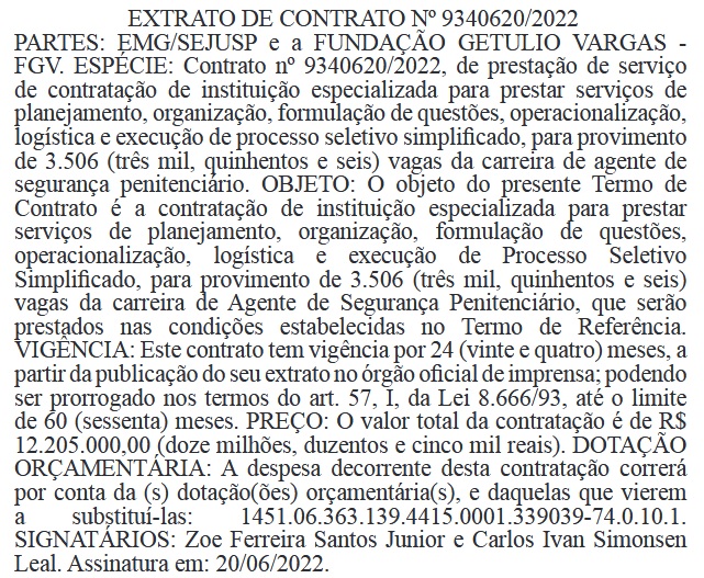 De acordo com o extrato de contrato n.º 9340620/2022 publicado nesta terça-feira no DOE-MG, a responsabilidades pelo planejamento, organização, formulação de questões, operacionalização, logística e execução de processo seletivo simplificado será da Fundação Getúlio Vargas (FGV).