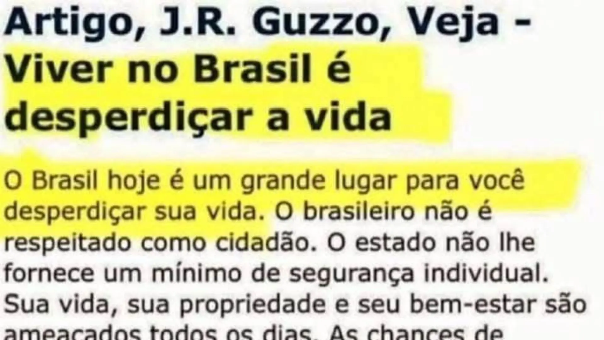 Nesses momentos em que a direita está em depressão, circula aos montes um texto atribuído ao falecido jornalista J. R. Guzzo, intitulado “Viver no Brasil é desperdiçar a vida”. É sempre um mesmo print, com marcações em amarelo. Meus cinco minutos como repórter investigativo, porém, não conseguiram provar a autenticidade do texto, supostamente publicado na revista Veja. Quero crer que não seja do Guzzo mesmo.